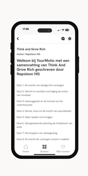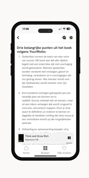 Daarom brengt YourMotio de kern van invloedrijke non-fictieboeken terug tot heldere lees- en luistersamenvattingen. Zonder afleiding, zonder druk. Alleen wat ertoe doet, op momenten die in jouw leven passen. Je kunt YourMotio gebruiken als zelfstandige bron van kennis, of als slimme aanvulling op boeken die je leest of luistert. Wat je leert leg je vast in notities en via herinneringen helpen we je om inzichten niet te vergeten, maar toe te passen.